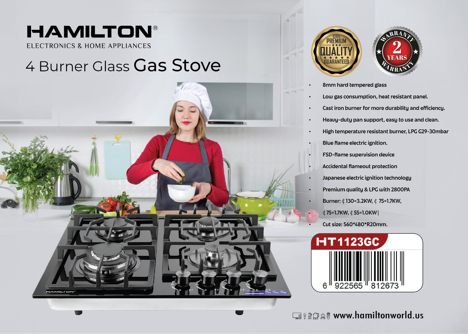 فرن غاز هاميلتون، 4 موقد، زجاج مقوى بسمك 8 مم