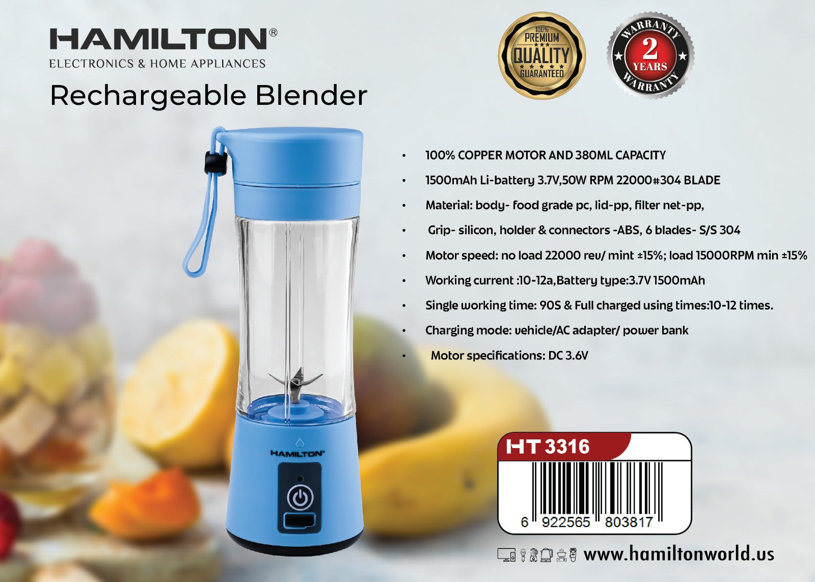 خلاط هاميلتون القابل للشحن، سعة 380 مل، قوة 50 واط